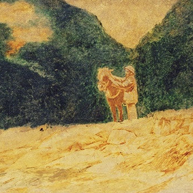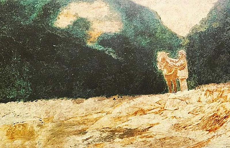 Trong bối cảnh thiên nhiên núi rừng hùng vĩ, hình ảnh Bác Hồ cùng chú ngựa trắng – hai nhân vật trung tâm – được đặt gọn gàng ở góc phải bức tranh. Cả hai hiện lên như một khối thống nhất, vững chãi, thể hiện sự hòa quyện giữa con người và thiên nhiên. Dáng vẻ bình thản, điềm tĩnh của Bác, cùng sự kiên định của chú ngựa, gợi ra hình ảnh người lãnh tụ giản dị nhưng đầy ý chí, sẵn sàng vượt qua mọi thử thách phía trước.