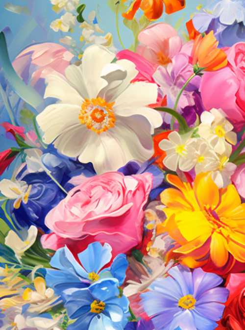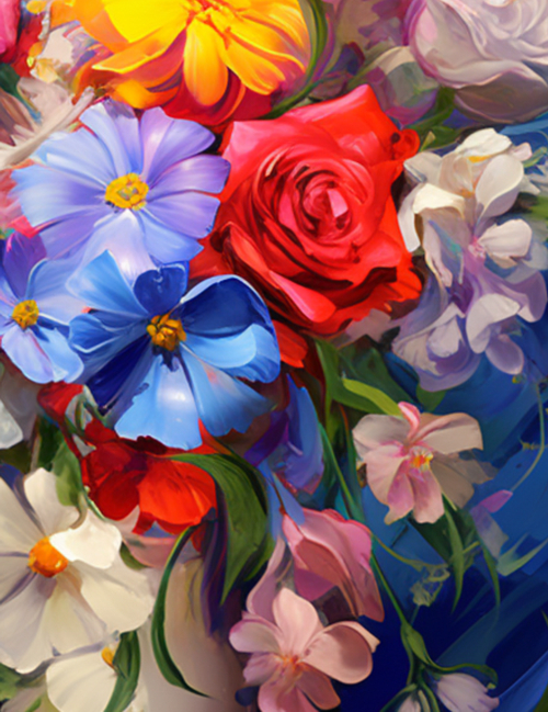Màu sắc sống động, hài hòa: Bức tranh sử dụng một bảng màu phong phú và rực rỡ, từ sắc đỏ nồng nàn của hoa hồng, vàng tươi của hướng dương, xanh dịu mát của hoa cẩm tú cầu, đến trắng tinh khôi của cúc họa mi và tím lãng mạn của hoa oải hương. Sự phối hợp tài tình này tạo nên một tổng thể đầy sức hút, mang lại cảm giác vui tươi và tràn đầy năng lượng.