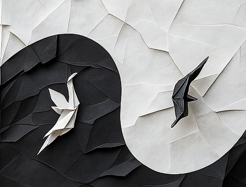 Nổi bật trên nền Âm Dương là hai chú chim hạc origami tinh xảo, một trắng và một đen. Chim hạc là biểu tượng của sự may mắn, trường thọ và hòa bình trong nhiều nền văn hóa Á Đông. Sự hiện diện của chúng trong bố cục Âm Dương càng làm tăng thêm ý nghĩa về sự đối lập nhưng lại bổ sung cho nhau, tạo nên một tổng thể hoàn chỉnh và hài hòa. Chim hạc trắng nhẹ nhàng bay lượn trên nền đen, trong khi chim hạc đen uyển chuyển trên nền trắng, thể hiện mối quan hệ tương hỗ và bất phân ly.