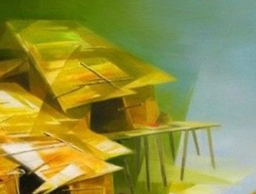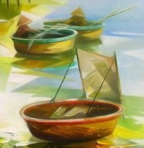 Tranh "Làng Chài" tái hiện khung cảnh thơ mộng của những ngôi nhà sàn ven sông, với những chiếc thuyền nhỏ neo đậu yên bình trên mặt nước. Bằng kỹ thuật vẽ điêu luyện và sự phối màu tinh tế, tác phẩm mang đến cảm giác chân thực và sống động về cuộc sống sông nước.