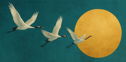 Bức tranh mô tả ba chú hạc trắng nhẹ nhàng bay qua ánh trăng vàng tròn – biểu tượng của sự viên mãn và trọn vẹn. Trong văn hóa phương Đông, hạc tượng trưng cho sự trường thọ, trí tuệ và điềm lành. Con số ba đại diện cho sự vững chắc, bền chặt và hài hòa trong các mối quan hệ.